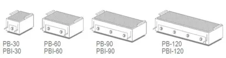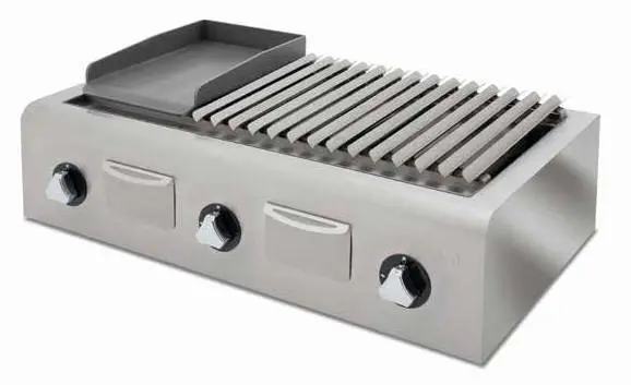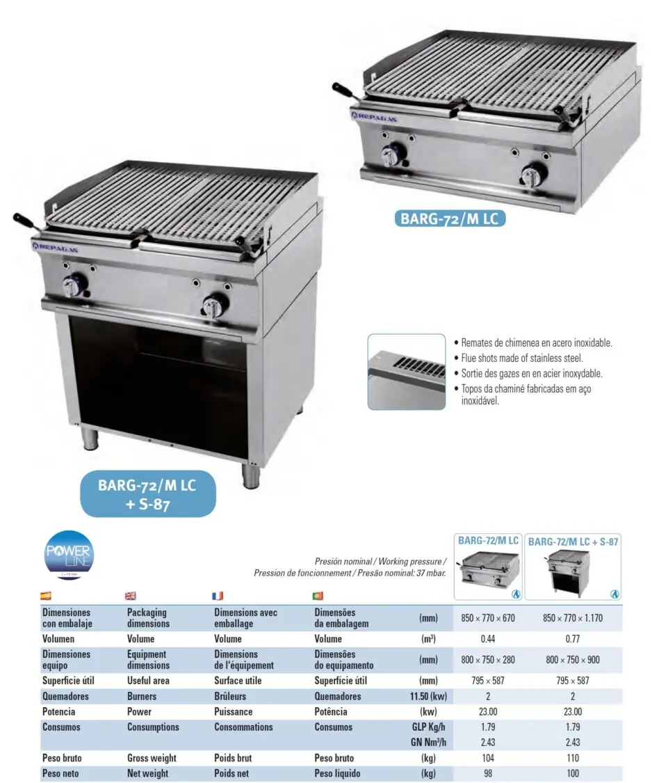 Fabricado en España con materiales de alta calidad. Construido en acero inoxidable acabado satinado de espesor 1 mm. Parrilla acanalada con acabado pavonado. Dotación de piedra volcánica. Parrilla regulable en 3 alturas con mandos de baquelita ajustables en anclajes. Quemadores tubulares de acero inoxidable de gran poder calorífico con termopar de seguridad. Grasera frontal de gran capacidad y fácilmente extraible fabricada en acero pavonado. Pies regulables de gran robustez. Opción. Parrilla acanalada en acero inoxidable. Mandos de baquelita de gran calidad con marcador de máximo/mínimo. Toma de gas por la parte trasera que facilita la instalación en sitios donde el aprovechamiento del espacio es esencial. De serie se suministran predispuestas para gas propano – butano y se proporcionan inyectores para cambios a gas natural.