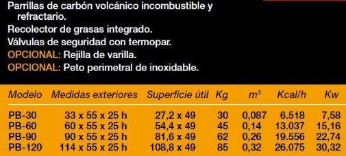 Potencia 13.01 kw. Construida en acero inox. No necesita piedra volcanica.
