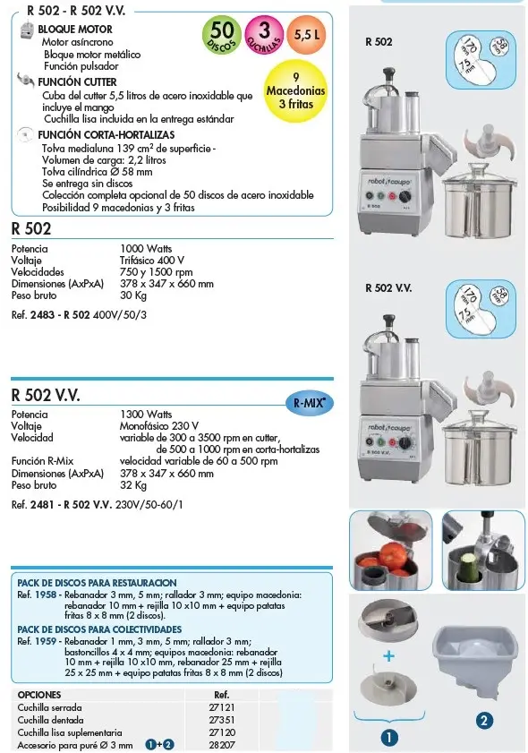 Potencia 1500 W. Boca entrada 139 cm2. Cutter Velocidad 300-3500 rpm. Cutter caldero 5,9 lt. Hortalizas velocidad 300-1000 rpm. Cantidad máxima cutter 3,2 kg. Rendimiento cortadorta 150 kg/h. Monofásica. Opcional 50 discos.