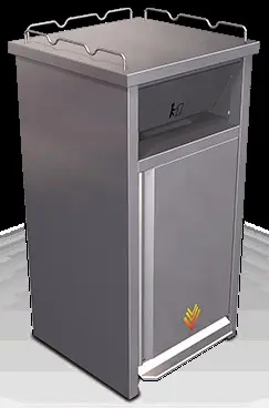 Fabricado totalmente con acero inoxidable. Sistema patentado de pedal. Permitirá al usuario abrir la trampilla sin necesidad de usar las manos. La trampilla también se puede abrir con la mano en caso de requerirlo. Las varillas de la parte superior del mueble facilitan la colocación de las bandejas. La tolva de caída de los desperdicios es de una sola pieza y no posee juntas ni huecos, lo que facilita la limpieza. Asa de la puerta ergonómica. El contenedor posee dos ruedas, lo que permite desplazarlo con poco esfuerzo. Provisto de dos tacos regulables en altura para adaptarse a cualquier clase de suelo, evitando desplazamientos accidentales o no deseados. Insonorizado en todas sus piezas.