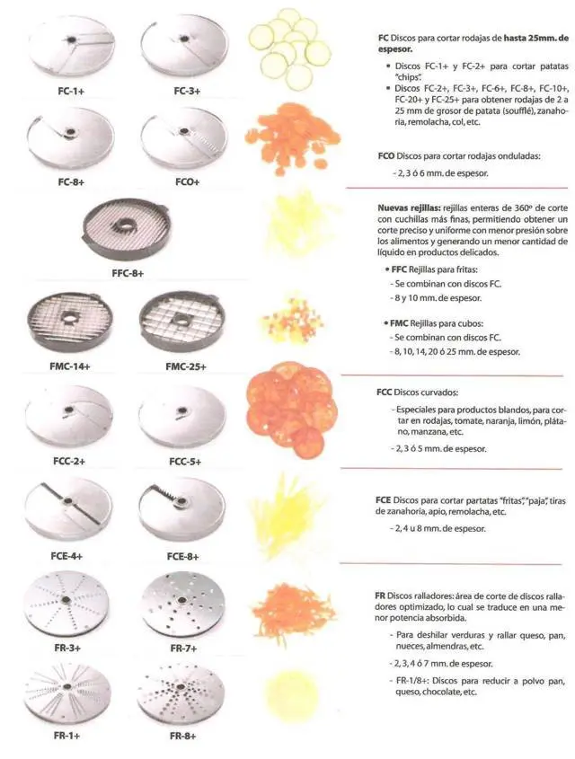 Pueden dotarse de una amplia gama de discos y rejillas de la más alta calidad. Combinando entre sí estos accesorios, se pueden obtener más de 70 tipos de cortes y rallados diferentes.