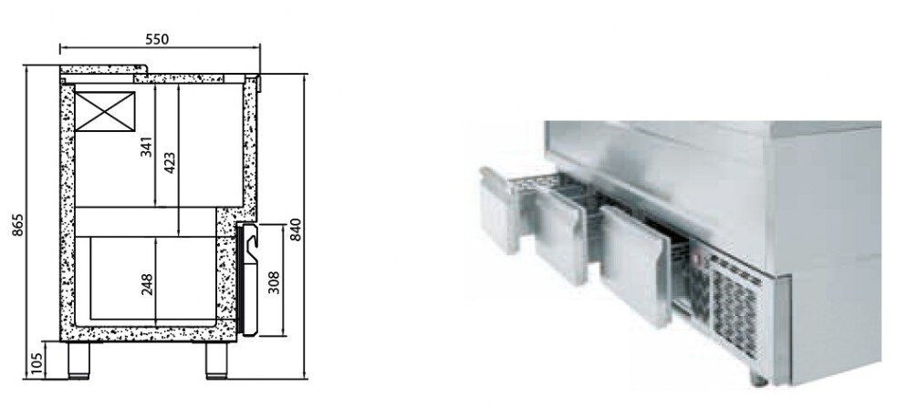 Frente exterior y costados en acero AISI-304. Interior en acero Inox. Evaporador estático. Control de temperatura. 2 Puertas inox deslizantes sobre bastidor. Y 1 cajon