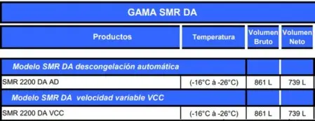 Capacidad 886 litros. Rango temperatura: -24ºC/ -16ºC. Desescarche automático gas caliente.