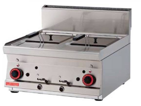 • Modelos a gas: acabado exterior y tapa de acero inoxidable AISI-304 (18/10) con acabado scotch, frontal completamente registrable, con piloto de encendido manual y con piezoeléctrico, termopar, regulación por válvula termostática EUROSIT 630 de 105 °C a 190 °C con termostato de seguridad adicional de calibración fija a 230 °C y quemadores fabricados en acero inoxidable perforados mediante láser. Sistema patentado de funcionamiento a través de perneos comunicantes difusores del calor, garantizando un aumento de la temperatura uniforme desde el nivel inferior del aceite consiguiendo mayor rendimiento con menor consumo. No recomendable para freír con producto harinado.