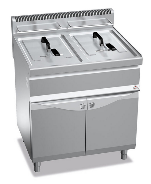 ConstrucciÓn - Modelo realizado en acero inox CrNi 18/10 AISI 304, con plano de 1 mm de grosor, satinado superficial Scotch-Brite, detalles cromados y perfiles redondeados. Plano dotado de alzado posterior. Mandos con grado de protección contra el agua IPX5. Modelo - Freidoras a gas, para uso profesional, de alta potencia y con una amplia superfice de calor. Con cuba única o doble, tapa y cesto en rejilla de acero cromado brillante, filtro cuba con soporte para cesta (si es necesario dos cestos de 1/2 para cuba única), con garantía absoluta de higiene. Encendido automático de llama piloto de los quemadores por medio de piezoeléctrico, válvula termostática y termopar. Descarga frontal del aceite, evacuación de humos posterior, completamente segura. ManutenciÓn - Facilitada gracias a un desmontaje simple del panel delantero. Dotaciones - Inyectores para un posible cambio de tipo de gas. Patas regulables en altura.