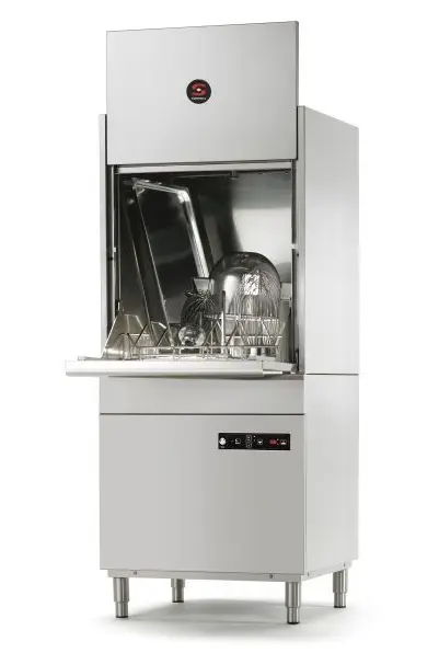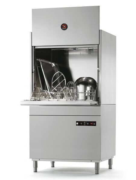 Construcción en acero inox. Brazos lavado y aclarado independientes en acero inox. Cuadro eléctrico a baja tensión 24 v. Doble pared con aislamiento térmico. Doble puerta contrabalanceada. Doble filtro. Bombas de aspiración lateral de alta capacidad de rendimiento. Calderín anti-corrosión con resistencia en acero inox. Micro seguridad puerta magnético. Programas de lavado automáticos. Bomba aumento presión aclarado. Dotación: 1 cesta y 1 inserto bandejas. Cuba de lavado estampada, autolimpiante, con ángulos redondeados sin soldaduras. Com sistema HY-NRG (incluye bomba presión aclarado, break tank, calderín atmosférico).