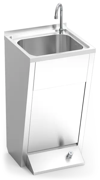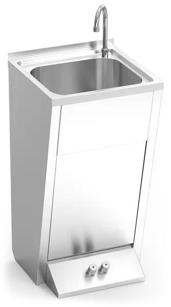 Totalmente construido en acero inoxidable. Sistema autónomo que no precisa instalación de tomas de agua, desagüe e instalación eléctrica. Este sistema funciona mediante un pulsador hidráulico que bombea el agua limpia desde uno de los depósitos de 10 lts situados en su interior, el otro es para el agua sucia. Dispone de sistema anti-olores. Con asa de arrastre posterior y ruedas para su fácil transporte. Cubeta con aristas frontales redondeadas, de gran dimensión y alta resistencia, provista de reborde antiderrames. Armario cerrado por tres lados, con estante interior y puerta frontal. Papelera integrada dentro del mueble. Cómodo y discreto acceso a papelera mediante trampilla basculante. Peto trasero anti salpicaduras instalado. Dosificador de jabón automático de 1 litro (funcionamiento a pilas) Dispensador de tisúes. Permite la introducción de cajas de tamaño estándar con tisúes, guantes, calzas, mascarillas, etc.