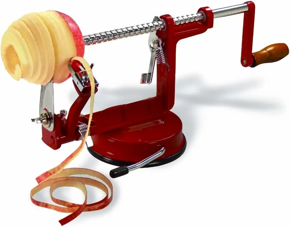 - El pelador de manzanas tiene 3 funciones en una: Pela la manzana, Quita el corazón, Y corta en rodajas.