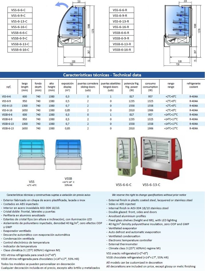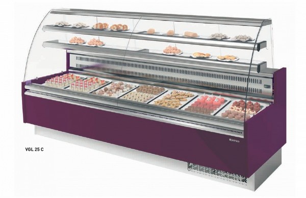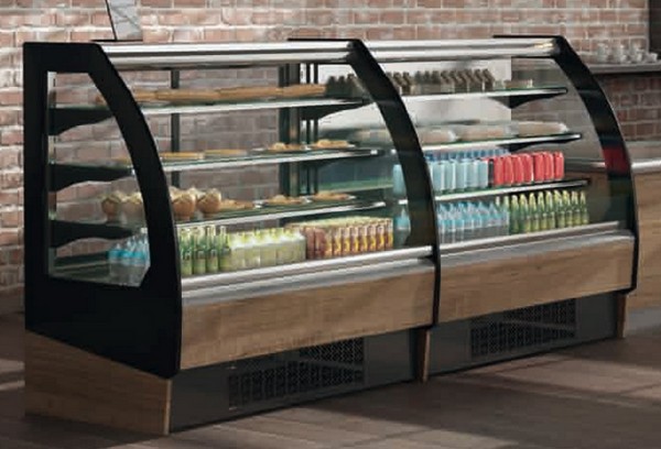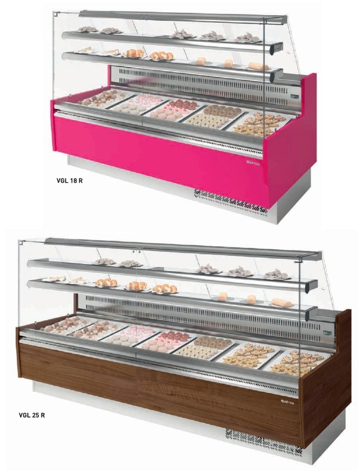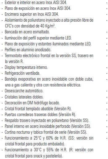 • temperature de trabajo: +3°/+5°c. • refrigeración estática. • cristales curvos abatibles (vcr). • tres entrepaños. • plano de exposición y tablero de trabajo de acero inox. • zócalos de acero inox. • decoración en madera. • disponible en la versión de panadería (neutra). • modular; ángulos, mesas y barra disponibles.