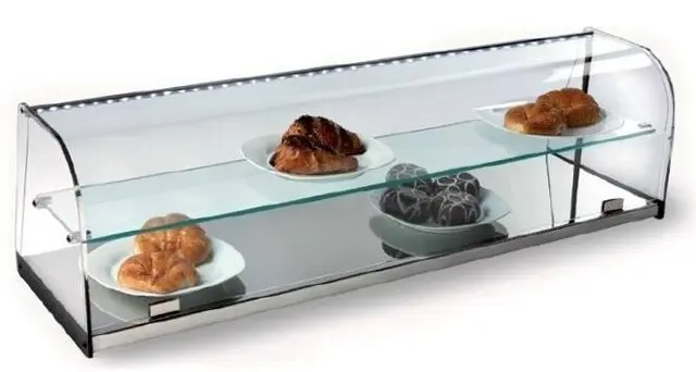 Vitrina construida sobre una base en acero inoxidable AISI-304. Cristal curvo FIJO TEMPLADO DE SEGURIDAD. Estante intermedio de cristal. Laterales en metacrilato de 8 mm. Iluminación LED OPCIONAL.