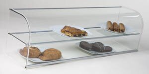 Vitrina totalmente en metacrilato. Cristal curvo. Puerta abatible en metacrilato.